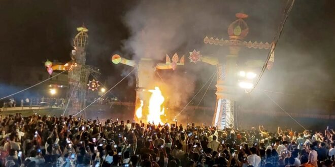 बिंदकी, फतेहपुर। नगर के श्री रामलीला मैदान में अहंकारी रावण के पुतले का दहन हुआ। पूरा मेला मैदान जय जय श्री राम के नारे से गूंज गया। श्री रामलीला मैदान में जिलाधिकारी रविन्द्र सिंह, पुलिस अधीक्षक अनूप कुमार सिंह, विधायक राजेंद्र सिंह पटेल व विधायक जयकुमार सिंह जैकी सहित भारी संख्या में लोग मौजूद रहे। कस्बे के श्री रामलीला मैदान में ऐतिहासिक दशहरा महोत्सव के तीसरे दिन मेले में भारी भीड़ जुटी। रामलीला मैदान में मर्यादा पुरुषोत्तम प्रभु श्री राम व उनकी सेना तथा दूसरे पक्ष से अहंकारी रावण व उनकी सेना के बीच जमकर युद्ध हुआ। गुरुवार को रात करीब आठ बजे प्रभु श्री राम ने अहंकारी रावण का वध किया। दशहरा महोत्सव की परंपरा के अनुसार मौजूद डीएम के आदेश के बाद अहंकारी रावण के पुतले का दहन किया गया। पुतला दहन होने के बाद पूरा मेला मैदान जय-जय श्री राम के नारे से गूंज गया। महोत्सव के तीसरे दिन श्री रामलीला मैदान में दोपहर बाद से ही लोगों की भीड़ आने लगी थी। नगर व आसपास के तमाम गांव की महिलाएं, पुरुष पैदल के अलावा विभिन्न साधनों से मेला मैदान में पहुंचे। मंदिर में श्री हनुमान जी की पूजा अर्चना किया। प्रसाद चढ़ाकर मन्नत मांगी। महिलाओं ने दुकानों में जमकर खरीददारी किया। बच्चों व युवाओं ने झूले का आनंद लिया। युद्ध जीतने के बाद प्रभु श्री राम और उनकी सेना श्री रामलीला मैदान के समीप स्थित रामेश्वर दयाल दयालु के आवास पहुंची। जहां पर प्रभु श्री राम और उनकी सेना की पूजा अर्चना दयालु गुप्ता ने की। इस मौके पर अमौली ब्लाक प्रमुख सुशीला सिंह, उप जिलाधिकारी बिंदकी प्रियंका अग्रवाल, पुलिस क्षेत्राधिकारी प्रगति यादव, कमेटी के अध्यक्ष शिवम सिंह परिहार उर्फ प्रमोद सिंह परिहार, सुधीर त्रिपाठी, राजेश गुप्ता राजा भैया, संरक्षक मंडल के नरेंद्र गुप्ता, अनिल गुप्ता चार्ली, गोपाल जी गुप्ता, रामेश्वर दयाल दयालु, अशोक गुप्ता कोल डिपो, सुनील गुप्ता, रामकुमार साहू, महामंत्री दिनेश मिश्रा, प्रतीक शुक्ला, गुलशन गुप्ता, उपाध्यक्ष गोविंद बाबू टाटा, आनंद गुप्ता, मुन्नालाल सोनकर, गोलन गुप्ता, मोना ओमर, नवीन सिंह, अनिल सोनकर, मधुराज विश्वकर्मा, अतुल द्विवेदी, विनय तिवारी, अनूप अग्रवाल, धीरू सिंह चौहान, डॉक्टर उत्कर्ष गुप्ता भी मौजूद रहे।