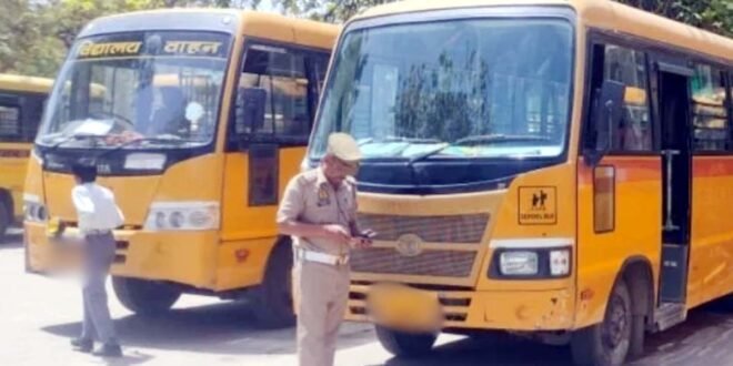 – स्कूली वाहनों की चेकिंग करती पुलिस।