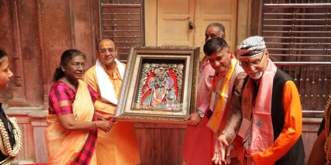 राष्ट्रपति द्रौपदी मुर्मू दुनिया की सबसे लग्जरी ट्रेनों में से एक महाराजा एक्सप्रेस से गुरुवार सुबह मथुरा के वृंदावन पहुंचीं। यहां उन्होंने ठाकुर बांके बिहारी मंदिर में दर्शन-पूजन किया। इसके बाद वह निधिवन पहुंचीं। यहां वृक्षों की पूजा की और 500 मीटर परिक्रमा लगाई। राष्ट्रपति श्रीकुब्जा मंदिर और सुदामा कुटी भी जाएंगी। वह गुरुवार सुबह 8 बजे दिल्ली से रवाना हुईं। करीब डेढ़ घंटे बाद यानी 10 बजे वृंदावन रोड रेलवे स्टेशन पहुंचीं। ट्रेन के 18 में से 12 कोच राष्ट्रपति और उनके स्टाफ के लिए रिजर्व रखे गए थे।