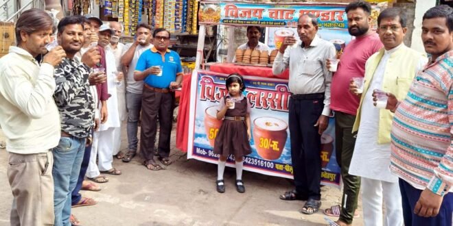 – निःशुल्क लस्सी वितरण करते व्यापारी नेता।