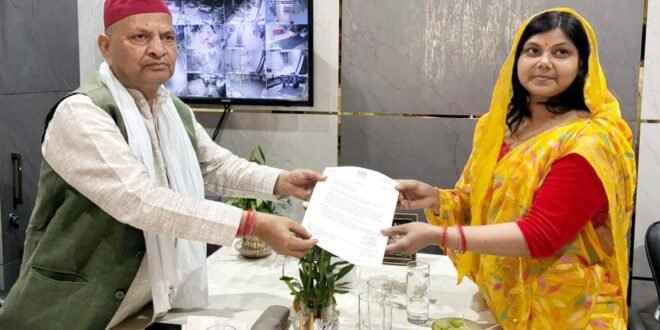 – राष्ट्रीय सचिव रानी शर्मा को मनोनयन पत्र देते सांसद नरेश उत्तम पटेल।