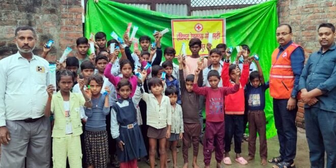 – बच्चों को लेखन सामग्री वितरित करते रेडक्रास चेयरमैन।