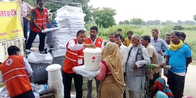 – बाढ़ पीड़ितों के बीच सामग्री का वितरण करते रेडक्रास चेयरमैन।