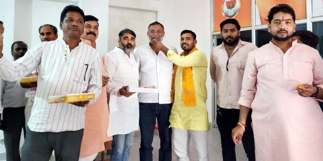 – आवास पर एक-दूसरे का मुंह मीठा कराते भाजपाई।