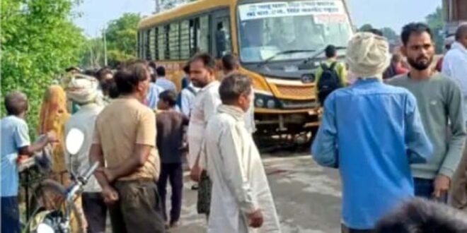 – घटनास्थल पर लगी भीड़ व खड़ी स्कूली बस।