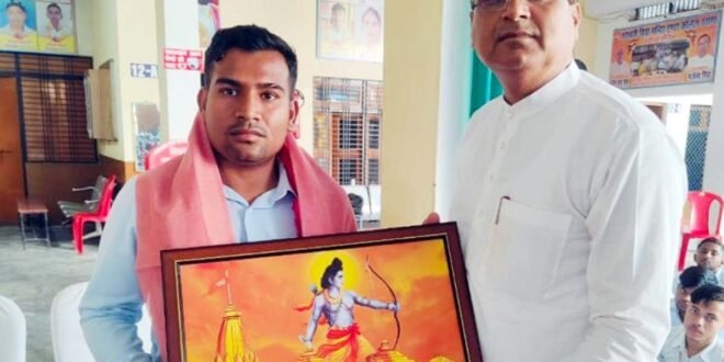 – पुरातन छात्र को भगवान श्रीराम का चित्र भेंटकर सम्मानित करते प्रधानाचार्य।