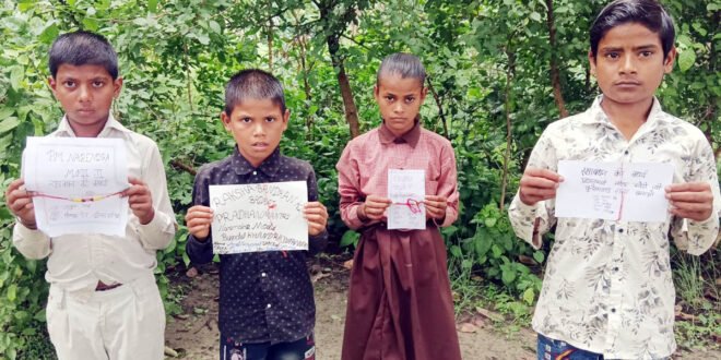 – पीएम को भेजे जाने वाले राखी पत्र दिखाते छात्र।