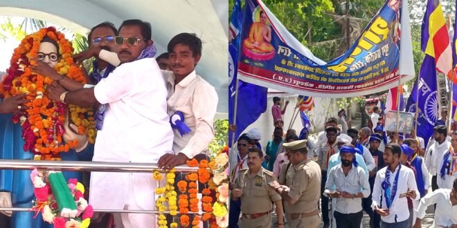 – बाबा साहब की प्रतिमा पर माल्यार्पण करते व शोभा यात्रा निकालते समिति के पदाधिकारी।