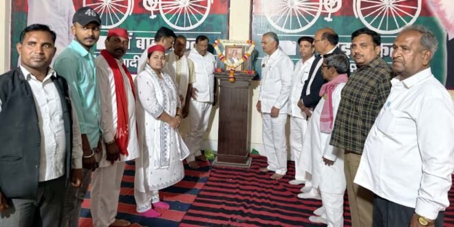 – पूर्व राज्यसभा सांसद के चित्र पर पुष्प अर्पित करते सपाई।