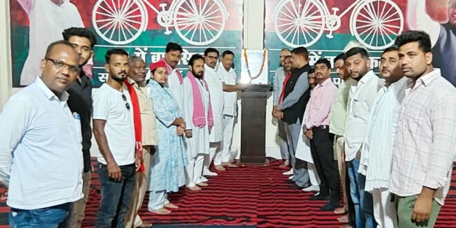 – कांशीराम जी के चित्र पर पुष्प अर्पित करते सपाई।