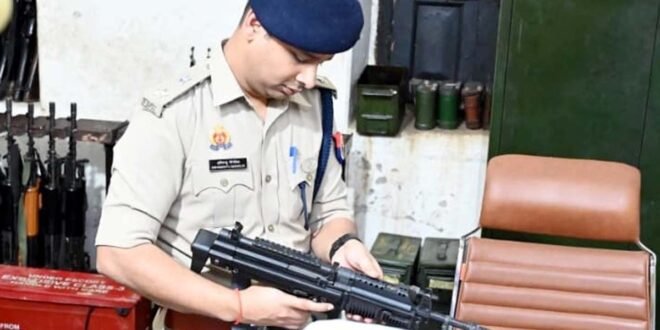 – शस्त्रागार में शस्त्र चेक करते एसपी अभिमन्यु मांगलिक।