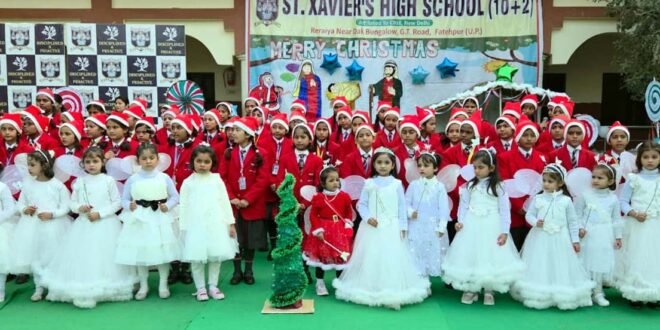 फतेहपुर। सेंट ज़ेवियर्स हाईस्कूल परिसर में क्रिसमस पर्व हर्षाेल्लास एवं आनंद के साथ मनाया गया। विद्यालय को आकर्षक ढंग से सजाया गया। जिससे पूरा परिसर उत्सवमय वातावरण से भर गया। कार्यक्रम के दौरान छात्रों ने मधुर क्रिसमस कैरोल गीत एवं नृत्य प्रस्तुत किए। बच्चों के बीच विशेष आकर्षण का केंद्र बने संता क्लॉज़ ने विद्यालय में आकर सभी छात्रों को उपहार एवं चॉकलेट वितरित की। संता को देखकर बच्चों के चेहरे खुशी से खिल उठे।