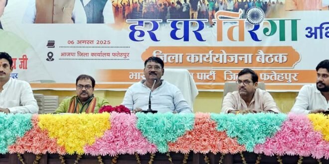 फतेहपुर। शहर के जेल रोड स्थित भारतीय जनता पार्टी कार्यालय में हर घर तिरंगा अभियान की कार्य योजना बैठक जिलाध्यक्ष मुखलाल पाल की अध्यक्षता में आयोजित हुई। जिसमें उपस्थित पार्टी पदाधिकारियों को अभियान की जिम्मेदारियां सौंपी। जिलाध्यक्ष मुखलाल पाल ने अपने संबोधन में कहा कि स्वतंत्रता दिवस के शुभावसर पर प्रत्येक वर्ष पार्टी के कार्यकर्ताओं व आमजनमानस के साथ तिरंगा यात्रा एवं अन्य देश भक्ति के कार्यक्रम आयोजित किए जाते रहे हैं। आने वाले स्वतंत्रता दिवस से पूर्व सेना के शौर्य पराक्रम व देश वासियों की एकजुटता के संकल्प से आपरेशन सिंदूर पूर्णतः सफल रहा है। देश के प्रधानमंत्री नरेंद्र मोदी ने आपरेशन सिंदूर की सफलता पर चर्चा करते हुए कहा है कि यह भारत के विजयोत्सव व गौरवगान का सत्र है। इसे देश के जन-जन के साथ उल्लास से मनाया जाना चाहिए, इसलिए हमें हर घर तिरंगा अभियान को सबसे बड़े त्योहार के रूप में मनाना चाहिए। बैठक में अभियान के जिला संयोजक व जिला उपाध्यक्ष डॉ ज्ञानेंद्र सचान ज्ञानू ने कहा कि आगामी 7-8 अगस्त को सभी मंडलों में हर घर तिरंगा अभियान हेतु बैठक एवं 10 से 12 अगस्त में तिंरगा यात्रा मंडल स्तर पर निकालनी है। वहीं 12 से 14 अगस्त के मध्य स्वतंत्रता संग्राम के स्मारकों में विशेष स्वच्छता कार्य एवं पुष्पांजलि कार्यक्रम करना है, अभियान के सहसंयोजक व जिला मंत्री मनोज मिश्रा मनु ने कार्यक्रम का संचालन करते हुए उपस्थित अभियान के मंडल संयोजकों सहसंयोजकों व पदाधिकारियों को अभियान की योजना बताते हुए उपस्थित जनों का आभार व्यक्त किया गया। जिला मीडिया प्रभारी प्रवीण सिंह ने बताया कि 14 अगस्त को विभाजन विभीषिका स्मृति दिवस के अवसर पर जिला मुख्यालय में मौन जुलूस, बैनर व प्ले कार्ड्स के साथ संगोष्ठी आयोजित होगी। कार्यक्रम में अभियान के सहसंयोजक द्वय सुशील सिंह चंदेल व प्रसून तिवारी, अपर्णा सिंह गौतम, पुष्पा पासवान, सुशीला मौर्या, रेखा मिश्रा, कुलदीप भदौरिया, मोना शुक्ला, ज्योति प्रवीण, अमित शिवहरे, विजय प्रताप सिंह, जसवंत गिहार, पवन मिश्रा, विक्रम सिंह चंदेल, अतुल त्रिवेदी, नितिन सिंह, शुभम् तिवारी, स्वरूप राज सिंह जूली, देवनाथ धाकड़े, प्रदीप गर्ग, शिव प्रसाद त्रिपाठी, सुनीता गुप्ता, संजय हाड़ा, संजय गुप्ता, गोरेलाल प्रजापति, शिव पूजन तिवारी, ओम प्रकाश पाल, दिनेश गुप्ता, भानु सिंह गौतम सहित अन्य मंडल अध्यक्ष, मडल प्रभारी एवं पदाधिकारी उपस्थित रहे।