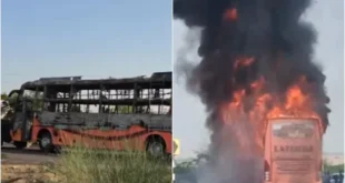 जैसलमेर-जोधपुर हाईवे पर 57 लोगों से भरी चलती एसी स्लीपर बस में आग लग गई। धू-धू कर जल रही बस …