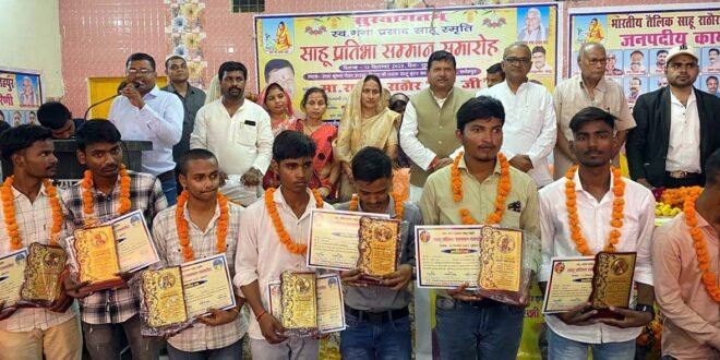 – समाज के मेधावी छात्र-छात्राओं को सम्मानित करते अतिथि।