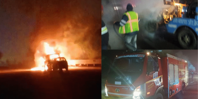 ग्रेटर नोएडा के यमुना एक्सप्रेसवे पर शनिवार देर रात एक भीषण सड़क हादसा हो गया. जेवर से नोएडा की ओर जा रही तीन कारें आपस में टकरा गईं, जिसके बाद दो गाड़ियों में अचानक आग लग गई. हादसे के बाद मौके पर अफरातफरी मच गई. लेकिन गाड़ियों में सवार लोगों ने सूझबूझ दिखाते हुए समय रहते बाहर निकलकर अपनी जान बचा ली. गनीमत ये रही कि इस हादसे में कोई जनहानि नहीं हुई. घटना के बाद यमुना एक्सप्रेसवे पर जाम लग गया. हादसे की सूचना मिलते ही पुलिस और फायर ब्रिगेड की टीमें मौके पर पहुंचीं. फायर ब्रिगेड ने कड़ी मशक्कत के बाद आग पर काबू पाया. आग बुझाए जाने तक दोनों गाड़ियां पूरी तरह जलकर राख हो चुकी थीं. इस हादसे में दो लोगों को मामूली चोटें आई हैं, जिन्हें उपचार के लिए अस्पताल भेजा गया जहां उनकी हालत स्थिर बताई जा रही है.