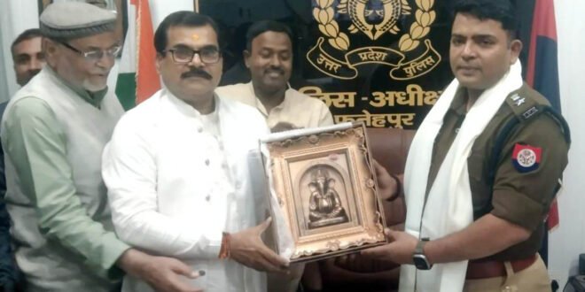 फतेहपुर। उत्तर प्रदेश उद्योग व्यापार मंडल के पदाधिकारी मंगलवार को पुलिस अधीक्षक कार्यालय पहुंचे। जहां एसपी अनूप कुमार सिंह से मुलाकात कर उनके कार्यकाल की जमकर प्रशंसा की तत्पश्चात प्रतीक चिन्ह व अंग वस्त्र भेंटकर सम्मानित किया। एसपी ने भी व्यापारियों को हरसंभव सहयोग का आश्वासन दिया। व्यापार मंडल के जिलाध्यक्ष राजेन्द्र प्रसाद मिश्र की अगुवई में एक प्रतिनिधि मंडल एसपी कार्यालय पहुंचा। जहां कप्तान से मुलाकात कर उन्हें अंग वस्त्र व प्रतीक चिंह भेंट करके सम्मानित किया। जिलाध्यक्ष श्री मिश्र ने कहा कि पुलिस अधीक्षक के नेतृत्व मंें जिले की पुलिसिंग व्यवस्था पहले से बेहतर हुई है। साथ ही अपराधियों में भी भय व्याप्त हुआ है। कई घटनाओं का पुलिस ने तत्काल खुलासा भी किया है। उन्होने एसपी के कार्यों को जमकर सराहा। उधर पुलिस अधीक्षक ने व्यापारियों को आश्वस्त किया कि जिले की पुलिस उनके साथ खड़ी है। किसी भी व्यापारी को कोई समस्याए आए तो वह सीधे उनसे संपर्क कर सकता है। इस मौके पर समीर अग्रहरि, अन्नू केसरवानी, नितिन गुप्ता, सतीश गुप्ता, उत्कर्ष सिंह, सुरेंद्र कुमार शर्मा, सोनू तिवारी, श्रीकांत अग्निहोत्री, अखिलेश कुमार, गुलजार सिंह, मनोज सिंह आदि व्यापारी प्रतिनिधि मौजूद रहे।
