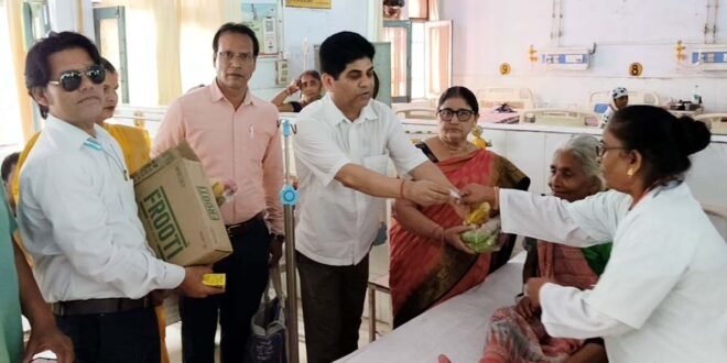 – जिला अस्पताल में मरीजों को फल वितरित करते सीएमएस व ट्रस्ट के पदाधिकारी।