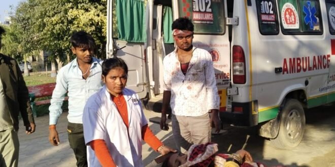 – घायल महिला को एंबुलेंस में ले जाते 102 कर्मी।