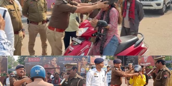 इटावा यातायात माह नवंबर 2025 के तहत शास्त्री चौराहे पर चला जागरूकता अभियान, दोपहिया चालकों को वितरित किए गए हेलमेट।