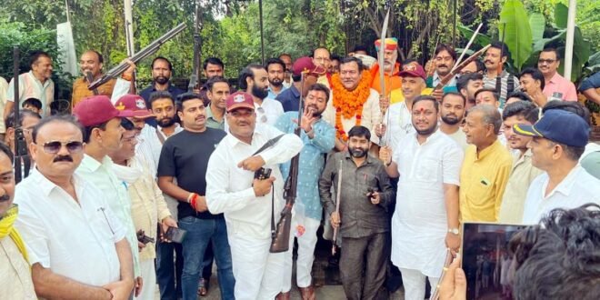 – शस्त्रों का प्रदर्शन करते भाजपाई।