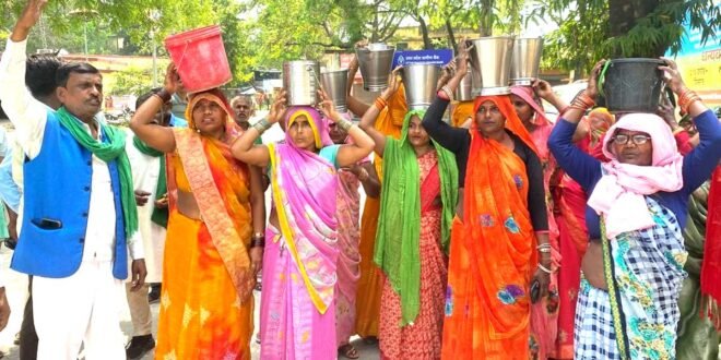 – सिर पर बाल्टी रखकर कलेक्ट्रेट में प्रदर्शन करतीं महिलाएं।