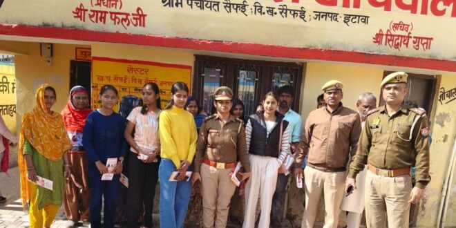 इटावा। मिशन शक्ति फेज 5.0 अभियान के अंतर्गत महिला सुरक्षा, सशक्तिकरण और जागरूकता को बढ़ावा देने के उद्देश्य से चलाए जा रहे कार्यक्रम के क्रम में दिनांक 05 फरवरी 2026 को थाना सैफई पर गठित महिला मिशन शक्ति टीम द्वारा ग्राम पंचायत सैफई में पहुंचकर महिलाओं व बालिकाओं को जागरूक किया गया, टीम द्वारा मिशन शक्ति के तहत पंपलेट वितरण किया गया, साथ ही महिलाओं और छात्राओं को सुरक्षा, स्वास्थ्य जागरूकता तथा साइबर अपराध से बचाव के संबंध में महत्वपूर्ण जानकारी दी गई, इस दौरान उन्हें विभिन्न महत्वपूर्ण हेल्पलाइन नंबरों और सरकारी योजनाओं के बारे में विस्तार से बताया गया, पुलिस टीम ने समझाया कि किसी भी प्रकार की परेशानी, उत्पीड़न या आपात स्थिति में तुरंत संबंधित हेल्पलाइन नंबर पर संपर्क करना चाहिए, घबराने के बजाय सतर्क रहना ही सुरक्षा का सबसे बड़ा उपाय है, अभियान के दौरान पुलिस आपातकालीन सेवा 112, स्वास्थ्य सेवा एवं एंबुलेंस 102 व 108, वीमेन पावर लाइन 1090, चाइल्ड हेल्पलाइन 1098, महिला हेल्पलाइन 181, मुख्यमंत्री हेल्पलाइन 1076, साइबर अपराध हेल्पलाइन 1930, एलपीजी गैस रिसाव हेल्पलाइन 1906 तथा उपभोक्ता अधिकार हेल्पलाइन 1915 की जानकारी दी गई, इसके अतिरिक्त महिलाओं को केंद्र एवं राज्य सरकार द्वारा संचालित जनकल्याणकारी योजनाओं जैसे विधवा पेंशन योजना, वृद्धावस्था पेंशन योजना, सुकन्या समृद्धि योजना, प्रधानमंत्री आवास योजना, मुख्यमंत्री सामूहिक विवाह योजना, नशा मुक्ति भारत अभियान, प्रधानमंत्री मातृ वंदना योजना, प्रधानमंत्री छात्रवृत्ति योजना, राष्ट्रीय स्वास्थ्य मिशन तथा आयुष्मान भारत PMJAY स्वास्थ्य बीमा योजना के बारे में भी जागरूक किया गया, पुलिस टीम द्वारा यह संदेश दिया गया कि स्वस्थ और सतर्क रहना ही असली सुरक्षा है, महिलाओं से अपील की गई कि वे इन योजनाओं और हेल्पलाइन नंबरों की जानकारी अपने परिवार, पड़ोस और मित्रों तक अवश्य साझा करें, छात्र-छात्राओं को पढ़ाई को प्राथमिकता देने तथा सरकारी योजनाओं का लाभ उठाकर अपना भविष्य उज्ज्वल बनाने के लिए प्रेरित किया गया, अभियान के दौरान उपस्थित महिलाओं और बालिकाओं ने पुलिस के इस प्रयास की सराहना की।