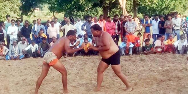– इनामी दंगल में दांव-पेंच दिखाते पहलवान।